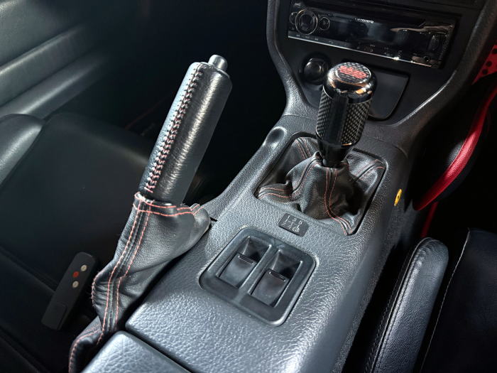 | シフトブーツ&サイドブレーキブーツ&サイドブレーキレバー 春木屋 (黒+赤のダブルステッチ) 内装やインテリアパーツに合わせて、黒地に赤ステッチを購入、取付。 以前に使用した他社製品は、素材にも起因して経年劣化が激しかったことから、 使用素材に注意しつつ、定番の春木屋をチョイス。 経年劣化はほぼなく、気持ちよく使えています。 MAZDA ロードスターターボ純正(レッドステッチ) 知る人ぞ知る、他社純正の流用。 近所のマツダディーラーで確認の上、 内装に合わせてレッドステッチを購入、取付。 純正を外してのポン付けです。 装着感はやや甘めですが、経年劣化はなく気に入っています。 |