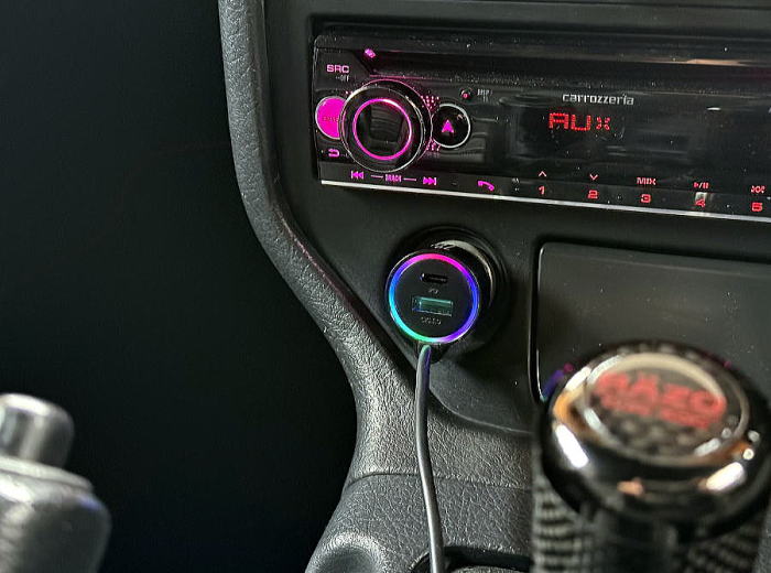 | シガーソケットカーチャージャー 急速充電 72W QC;PD 3ポート USBカーチャージャー車載充電器 1.5MタイプCコイルケーブル&虹色LED付 長年使い続けたスマホ充電器の形状が今一つ満足できず、 あれこれと探したところ、この製品に辿り着きました。 普段は黒のメクラ蓋でシガーライターソケット部分を目立たないようにしており、 ナビや音楽配信でスマホの消費電力が上がる際に限って、こうした充電器を使用しています。 この製品ではタイプC接続線が本体横から出ており、さらに本体側でタイプCとUSB接続が可能。 これでスマホ充電と並行して、電子タバコ本体の充電も可能となりました。 また、ご覧の通り本体側で光るLEDはレインボー色に輝いており、なかなか目立っています。 |
