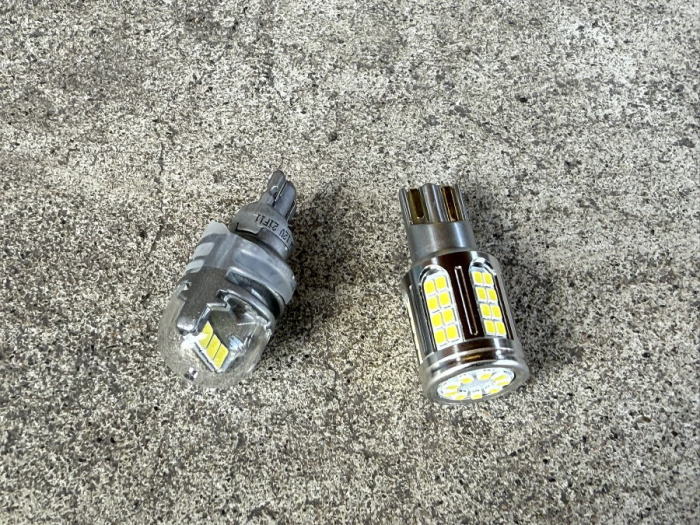 | バックランプ HID屋 トレーディングトレード T16 11990ルクス LED 爆光シングル車検対応ホワイト 6500K 最初に純正からスフィアライト製のバックランプに換えたのですが、 あまりにフッティングが悪く、 明るさ自体は明るいものの明るすぎるゆえなのか、 バックモニターでの視認性がまるで悪くて、夜間時は役立たず。 そういうものかと思いつつ、 フッティングの悪さ解消から選んだ2セット目が画像左側のフィリップス製。 視認性を良くしようとスフィア製より光量を落としたのですが、 やはり夜間時のバックモニターでは役立たず。 この製品もフッティングとしては甘めだったので装着時にテープにて補強、これまで3年半使ってきました。 ちなみに、200系クラウンはお尻が上がっているため そもそもリア窓越しの確認は難しく、バックモニターに頼るしかありません。 ところで所詮、この手のものはドレスアップのためだけなのかと思い、 夜間時のバックモニターの視認性は諦めていたところ、 たまたまネットで同型のクラウン装着時の評として、 バックモニターの視認性が良いという口コミの製品を見つけましたた。 それが、画像右側の製品。 かなりの爆光、しかもバックモニターでちゃんと見えるという口コミ、ここがミソ。 早速交換したところ、やはり右側のフィッティングが甘いのですが、 どうやら受け側に問題があるようで、従前同様、テープ補強しました。 さて、明るい上にモニターでちゃんと確認できるようになりました。 視認性向上、長年のストレスは解消されました。 |