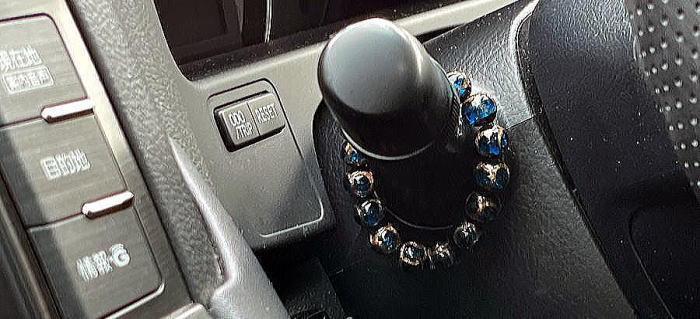 | 小ブレスレット 汎用 室内用アクセサリー ガラス玉小ブレスレット(ブルー+ゴールド) 汎用 単なるアクセサリーです。 これまでの経緯は以下の通り。 ある理由から手首用の天然石ブレスレットを購入。 色褪せしてきたため新調し、 使い続けてきたブレスレットは車のインテリアへ(画像の位置)。 ところで新調して使い続けたブレスレットは3年ほどで紐が切れて 一部の石を紛失したため、その後は使用せず。 車内アクセサリー用のブレスレットは真夏の猛暑で紐が切れて脱落。 長年付けていたため急に無くなると寂しくなり、 安価のガラス玉でもよいので デザイン性の良い小径のアクセサリーを探して購入し再び装着(画像のとおり)。 球自体には綺麗な濃いブルー色にゴールドがあしらわれており、 小径サイズも丁度良いサイズ感で満足しています。 室内のお洒落度も増しました。 追記 ブレスの紐は白いビニールで、長さも余裕がありすぎてダラーンとしていたので、 100均でブルーの紐を購入し、付け替えて長さも調整、スッキリしました。 |