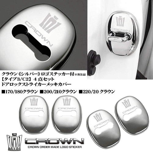 | ドアロックストライカーカバー 汎用 クラウン タイプ3 C2 王冠 CROWNロゴマーク付 シルバー メッキ 鏡面 純正のカバーの上からパカッと被せて付属の両面テープで貼り付けるだけの、 お手軽なドレスアップです。 鏡面メッキ仕上げで綺麗に輝いて見えます。 装着感、フィッティングはやや甘いですが、 そんなにジロジロ見るものでもないので、まあ良しとしましょう。 |